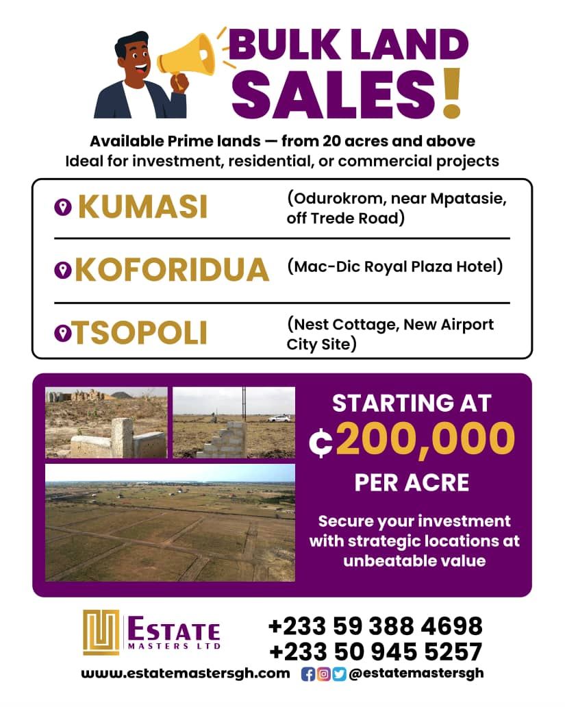 Secure prime lands in Kumasi, Koforidua and Tsopoli starting at just GH₵200,000 per acre. Ideal for investment, residential or commercial use. Don’t miss out on this great opportunity!